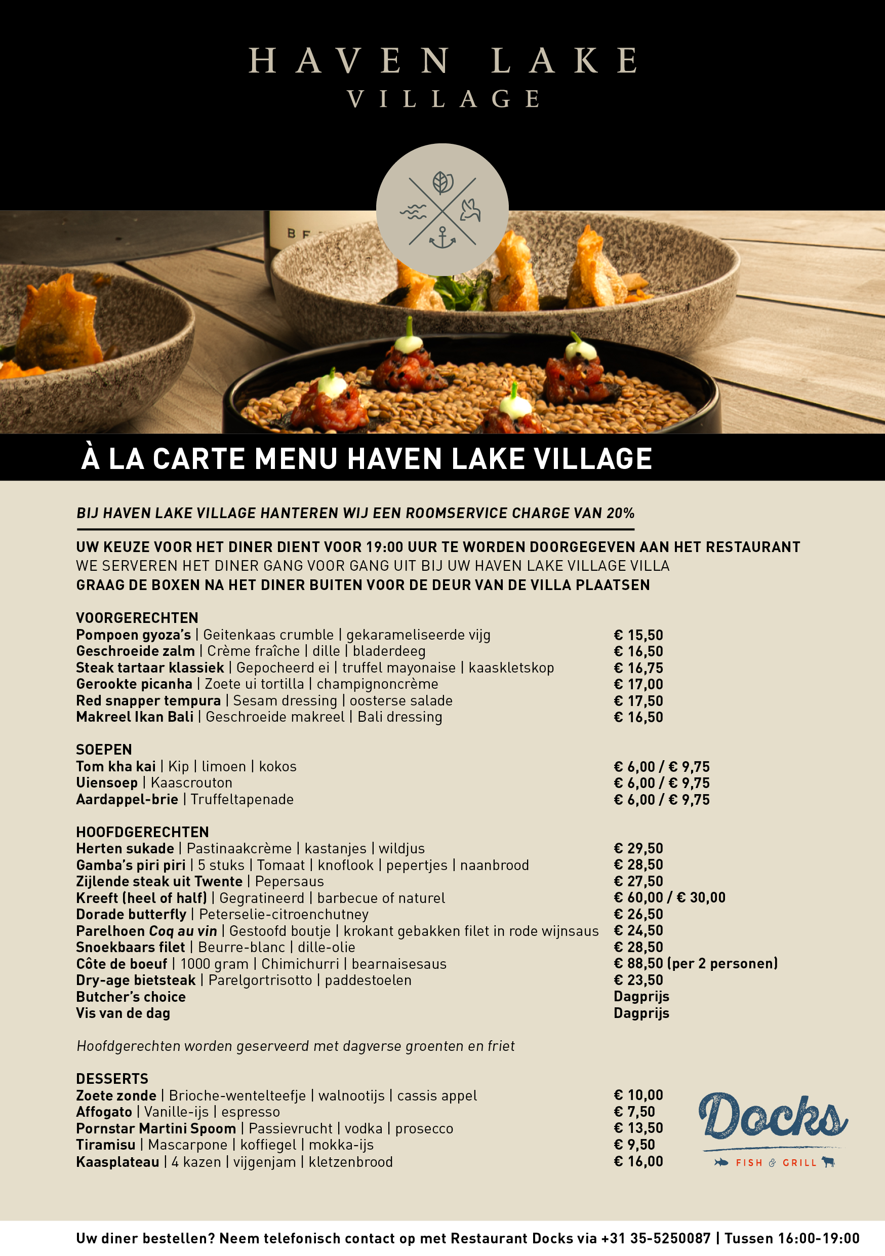 Maak uw verblijf compleet en geniet van onze full restaurant experience service in uw eigen villa. Heerlijk dineren aan de ronde tafel op het riante buitenterras van Haven Lake Village? De roomservice, het ontbijt en het à la carte diner worden verzorgd door ons naastgelegen restaurant Docks Fish & Grill.